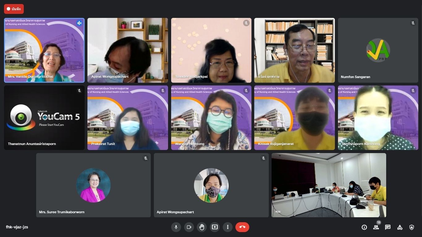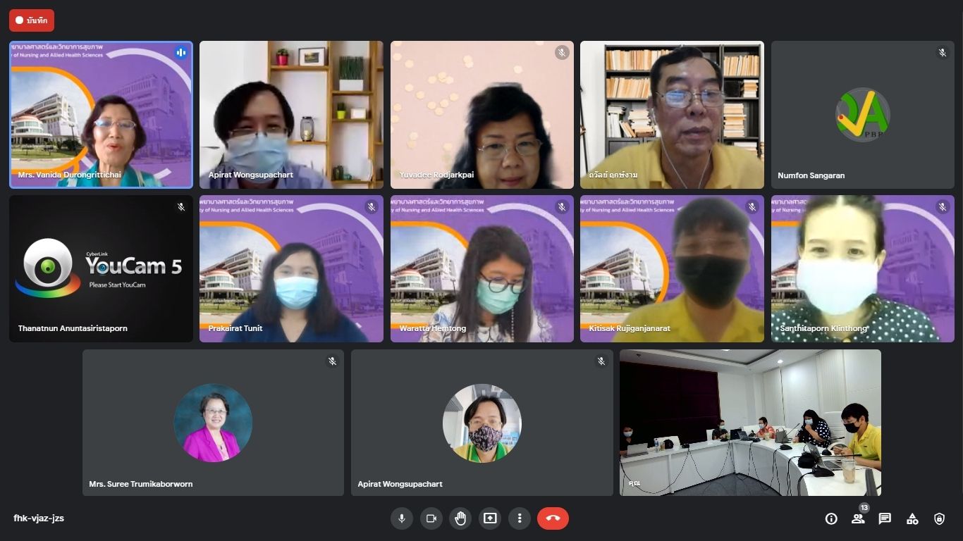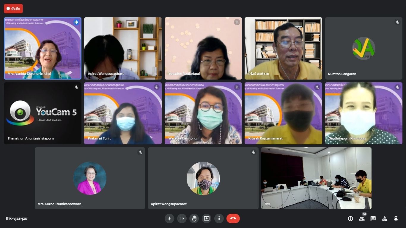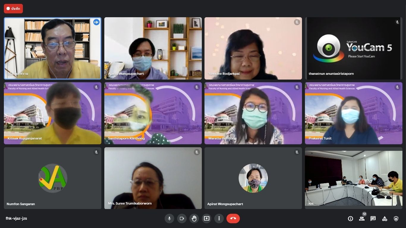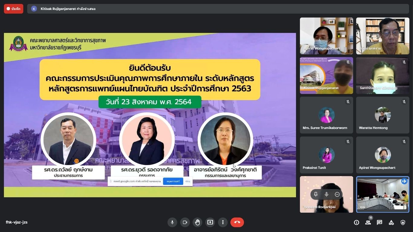 คณะพยาบาลศาสตร์และวิทยาการสุขภาพ โดย ผู้ช่วยศาสตราจารย์ ดร.วนิดา ดุรงค์ฤทธิชัย คณบดีคณะพยาบาลศาสตร์และวิทยาการสุขภาพ และคณาจารย์ ยินดีต้อนรับและขอบพระคุณคณะกรรมการตรวจประเมินประกันคุณภาพการศึกษาภายใน ระดับหลักสูตร หลักสูตรการแพทย์แผนไทยบัณฑิต ประจำปีการศึกษา 2563 วันที่ 23 สิงหาคม 2564 ได้รับเกียรติจาก รองศาสตราจารย์ ดร.ถวัลย์ ฤกษ์งาม รองศาสตราจารย์ ดร.ยุวดี รอดจากภัย และอาจารย์อภิรัตน์ วงศ์ศุภชาติ ประเมินคุณภาพการศึกษาและให้ข้อเสนอแนะต่างๆ ในการพัฒนาคุณภาพการจัดการศึกษาที่มีคุณภาพและได้มาตรฐานอย่างต่อเนื่องของหลักสูตรต่อไป
