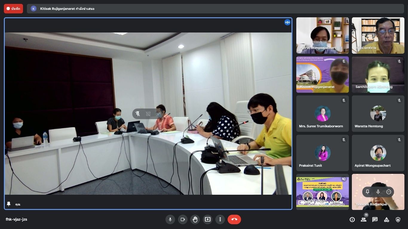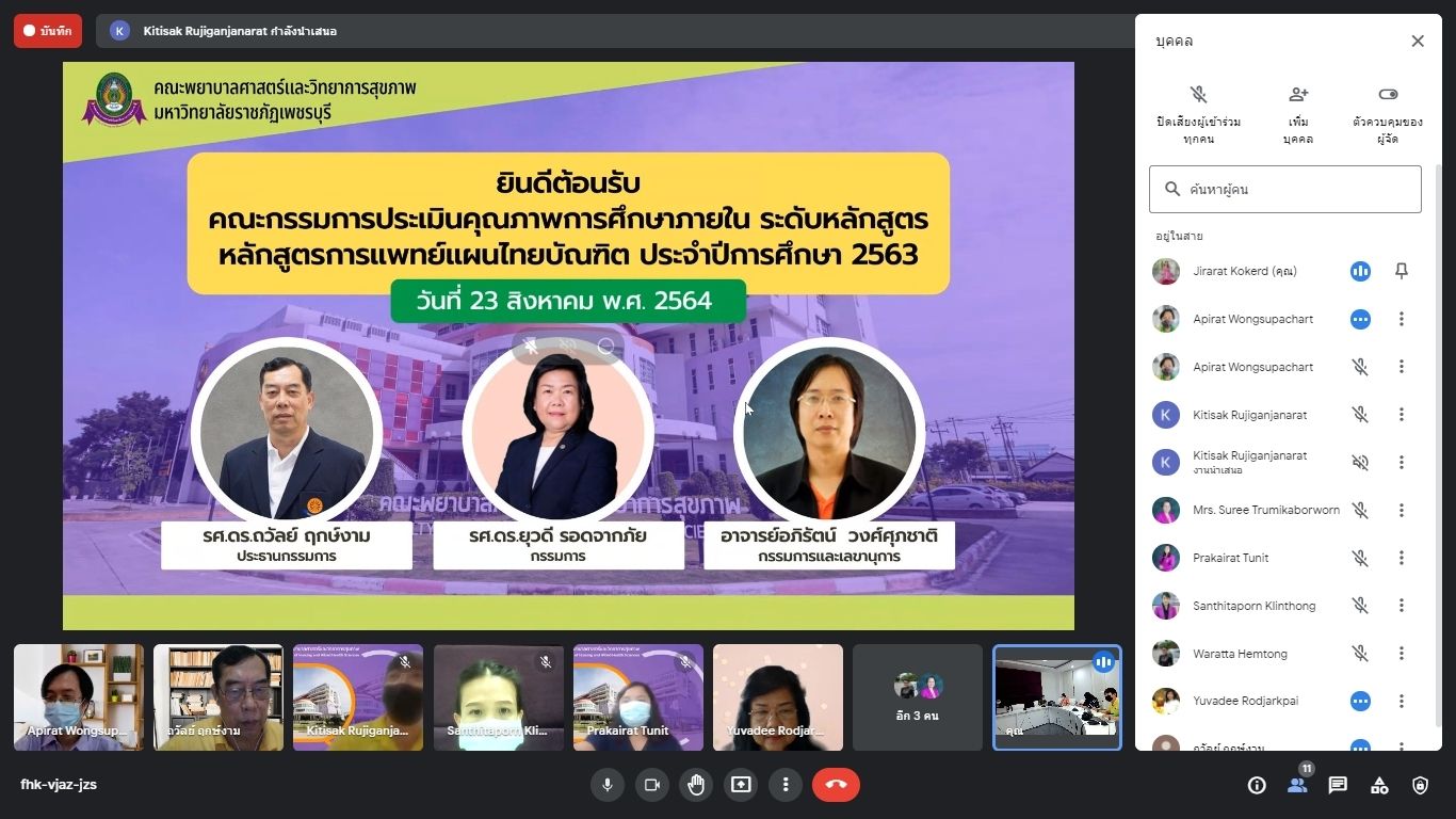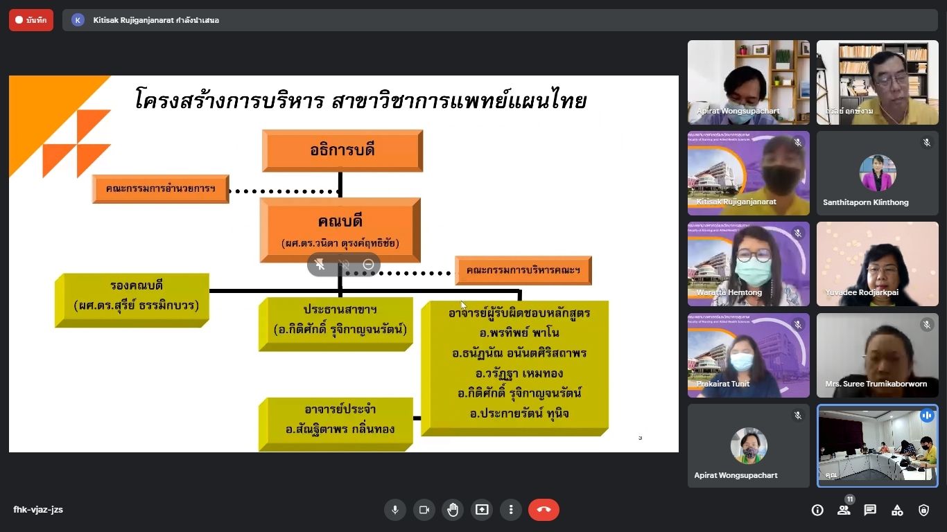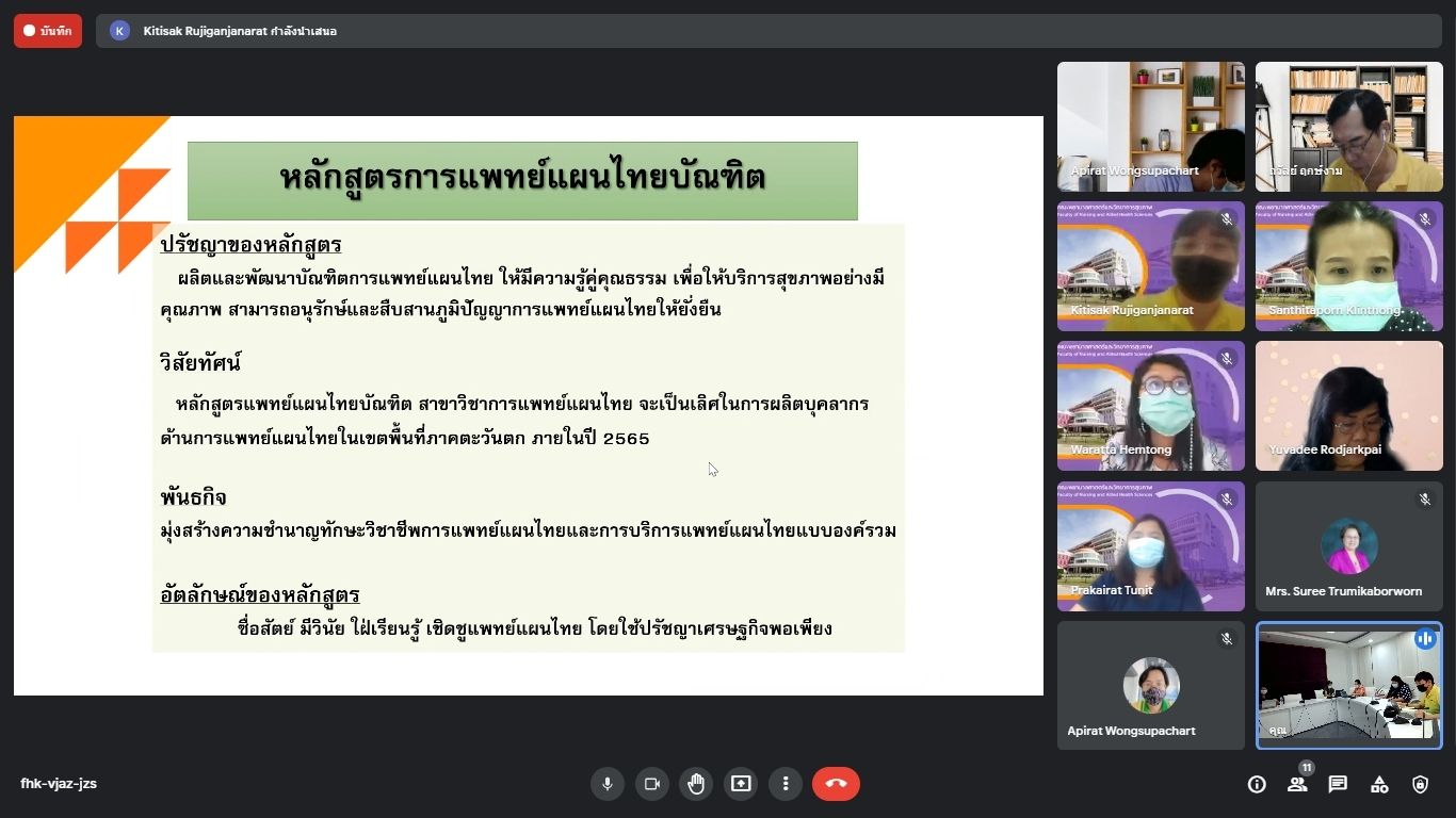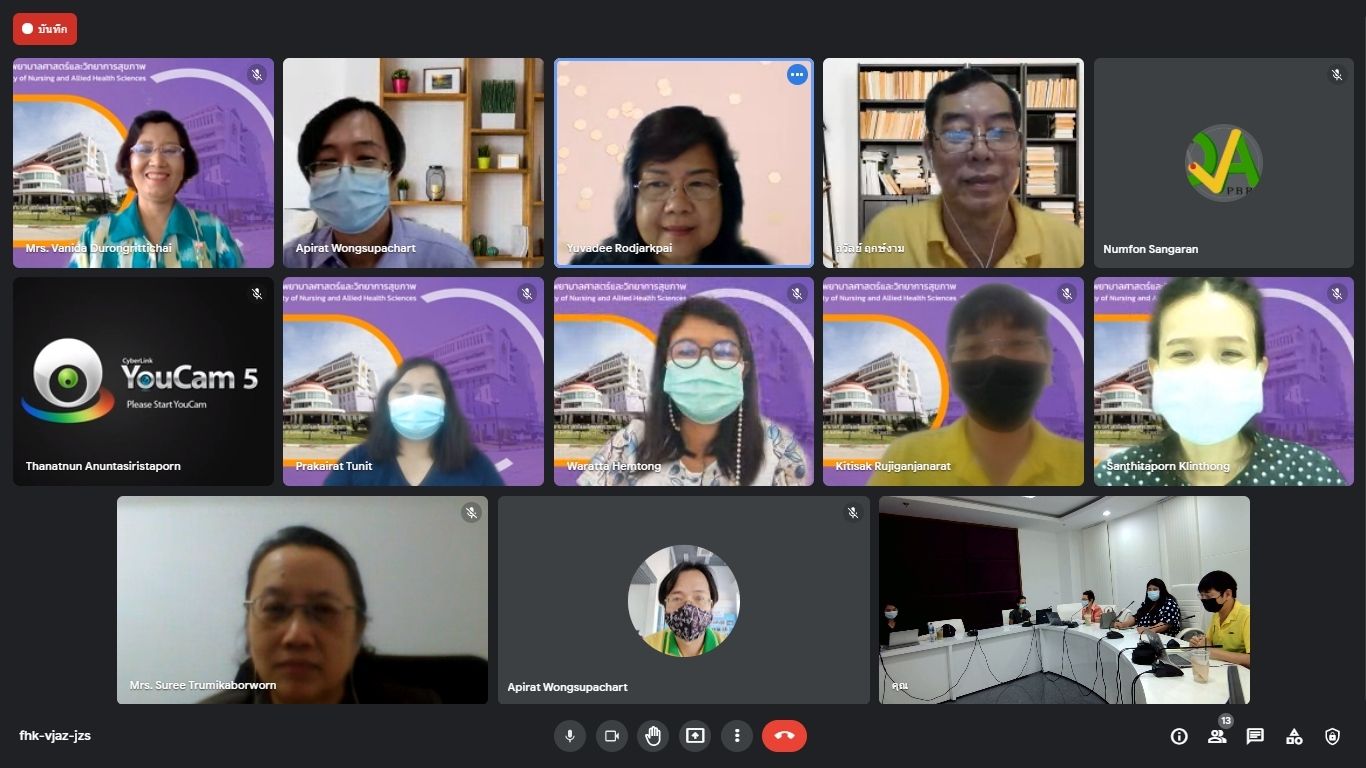 คณะพยาบาลศาสตร์และวิทยาการสุขภาพ โดย ผู้ช่วยศาสตราจารย์ ดร.วนิดา ดุรงค์ฤทธิชัย คณบดีคณะพยาบาลศาสตร์และวิทยาการสุขภาพ และคณาจารย์ ยินดีต้อนรับและขอบพระคุณคณะกรรมการตรวจประเมินประกันคุณภาพการศึกษาภายใน ระดับหลักสูตร หลักสูตรการแพทย์แผนไทยบัณฑิต ประจำปีการศึกษา 2563 วันที่ 23 สิงหาคม 2564 ได้รับเกียรติจาก รองศาสตราจารย์ ดร.ถวัลย์ ฤกษ์งาม รองศาสตราจารย์ ดร.ยุวดี รอดจากภัย และอาจารย์อภิรัตน์ วงศ์ศุภชาติ ประเมินคุณภาพการศึกษาและให้ข้อเสนอแนะต่างๆ ในการพัฒนาคุณภาพการจัดการศึกษาที่มีคุณภาพและได้มาตรฐานอย่างต่อเนื่องของหลักสูตรต่อไป