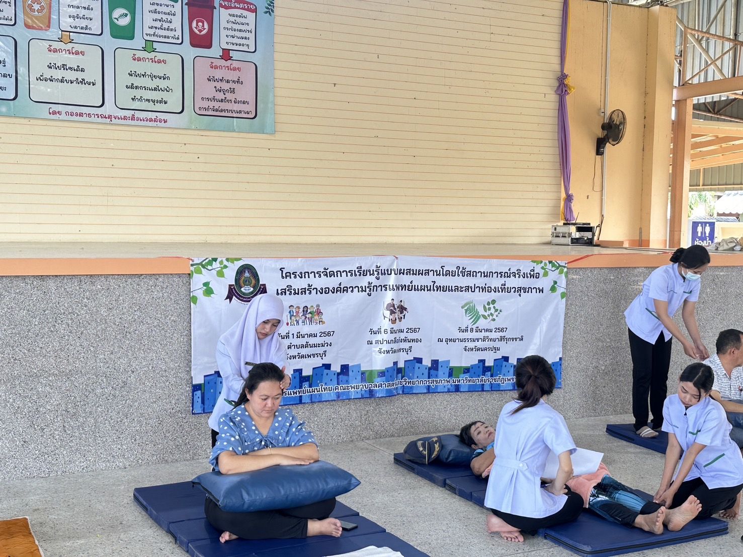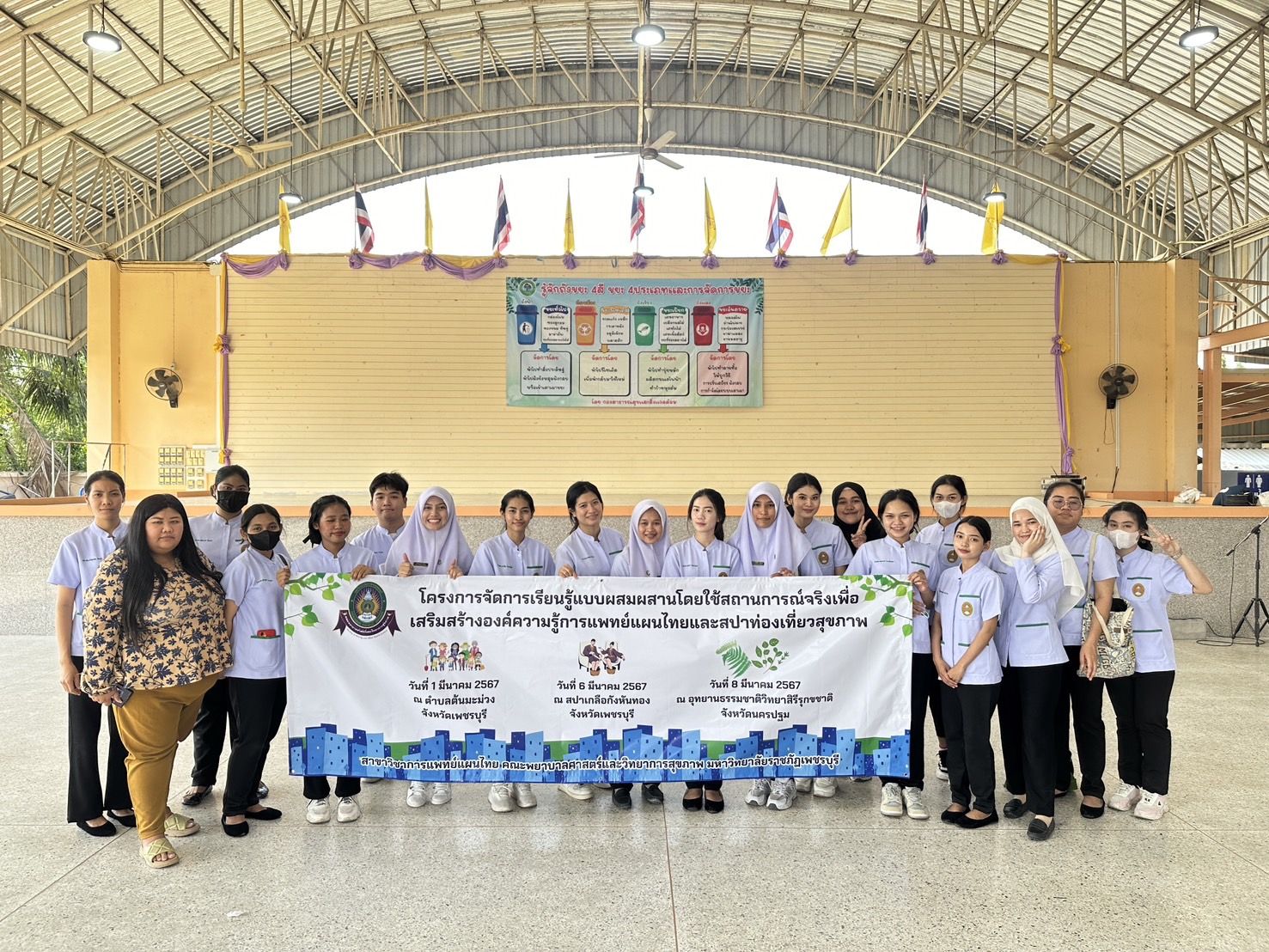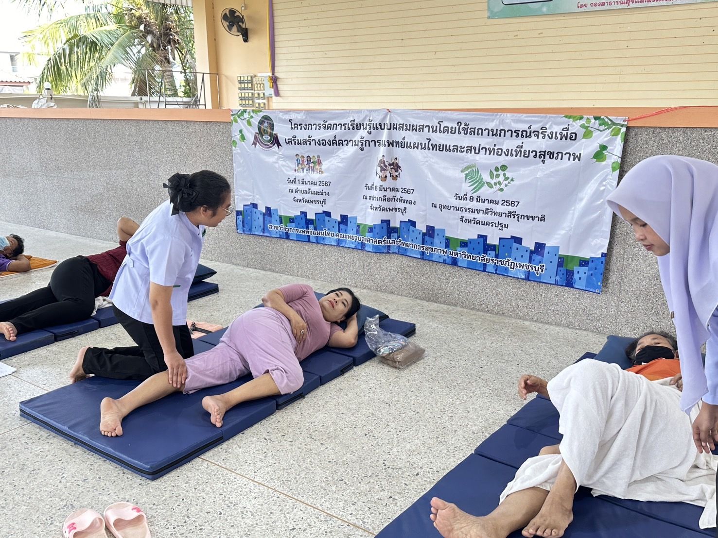วันที่ 1 มีนาคม 2567 นักเรียนแพทย์แผนไทยชั้นปีที่ 3 ได้ออกบริการวิชาการ ซักประวัติตรวจร่างกายวินิจฉัยโรคทางการแพทย์แพทย์แผนไทย ทำหัตถการ ได้แก่ การนวด ประคบสมุนไพร การแช่เท้าสมุนไพร และให้คำแนะนำ แก่ประชาชนตำบลต้นมะม่วง จังหวัดเพชรบุรี ภายใต้โครงการจัดการเรียนรู้แบบผสมผสานโดยใช้สถานการณ์จริงเพื่อเสริมสร้างองค์ความรู้การแพทย์แผนไทยและสปาท่องเที่ยวสุขภาพ ณ องค์การบริหารส่วนตำบลต้นมะม่วง อำเภอเมือง จังหวัดเพชรบุรี เพื่อให้นักศึกษาได้ฝึกปฏิบัติในชุมชน เกิดการต่อยอดองค์ความรู้ ทักษะทางวิชาการและวิชาชีพ อีกทั้งยังเป็นการบริการวิชาการแก่ประชาชนทั่วไปโดยมีผู้เข้ารับการบริการด้านการแพทย์แผนไทย จำนวน 47 คน