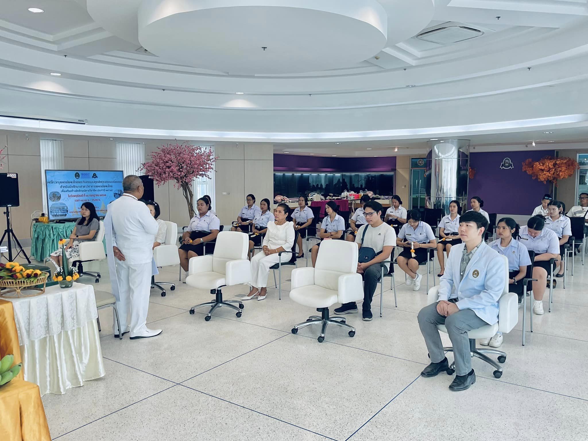 🔶หลังจากกิจกรรมไหว้ครู ผู้ช่วยศาสตราจารย์ ดร.พท.อาวุธ หงษ์ศิริ กรรมการวิชาชีพและประธานสาขาวิชาการแพทย์แผนไทย มหาวิทยาลัยราชภัฏบ้านสมเด็จเจ้าพระยา เป็นวิทยากรบรรยายเชิงปฏิบัติการ เรื่อง “การประกอบพิธีไหว้ครูตามอัตลักษณ์วิชาชีพแพทย์แผนไทย”และ “คุณธรรม จริยธรรมสำหรับนักศึกษาแพทย์แผนไทย”