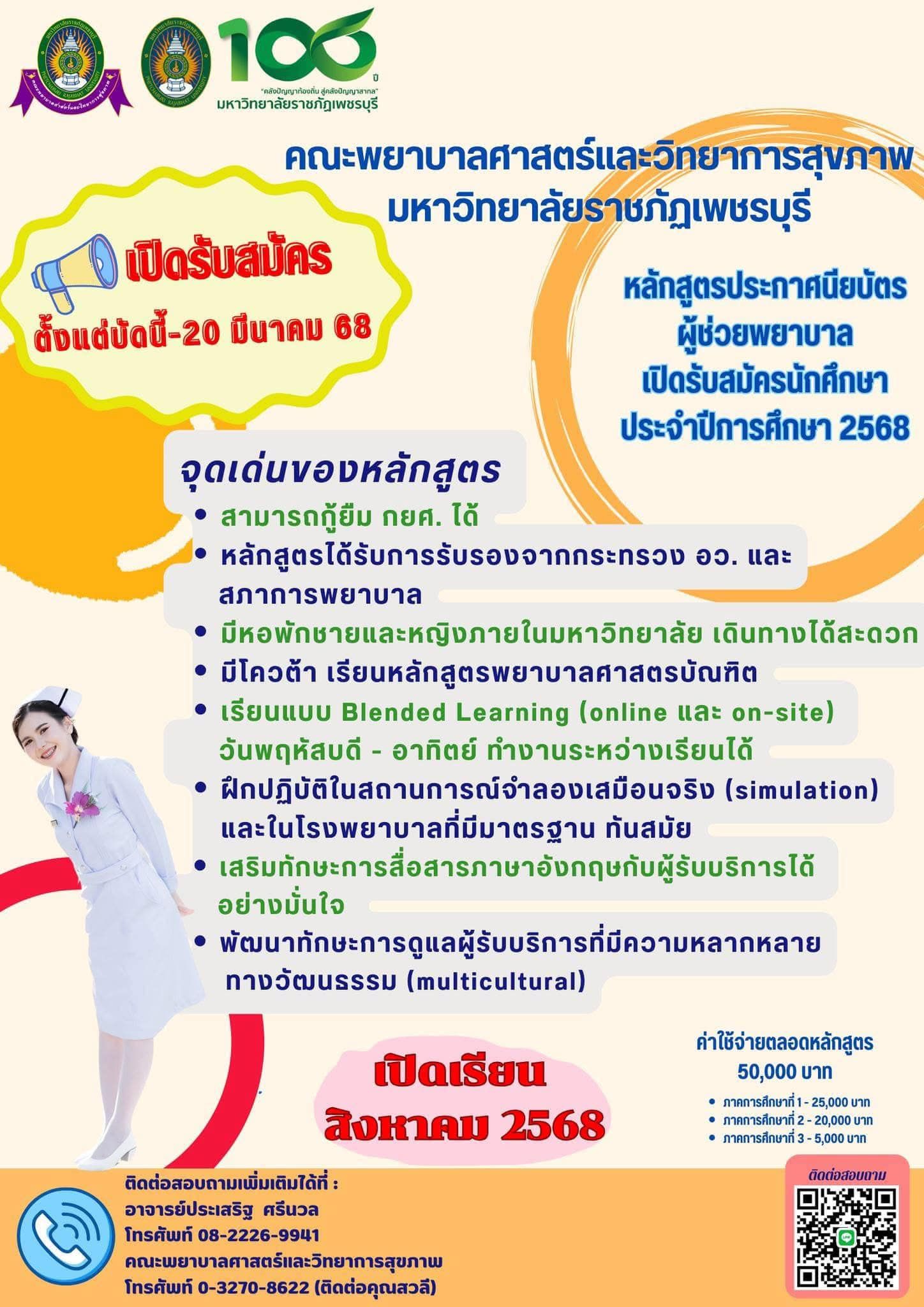 ผู้ช่วยศาสตราจารย์ ดร.เสนาะ กลิ่นงาม อธิการบดีมหาวิทยาลัยราชภัฏเพชรบุรี ผู้ช่วยศาสตราจารย์ เรือเอกหญิง ดร.สุพัตรา นุตรักษ์ คณบดีคณะพยาบาลศาสตร์และวิทยาการสุขภาพ คณะผู้บริหาร และคณาจารย์ เข้าพบผู้บริหารโรงพยาบาลหัวหิน โดยได้รับเกียรติจาก พว.จารุณี ตั้งใจรักการดี รองผู้อำนวยการกลุ่มภารกิจด้านการพยาบาล และหัวหน้าหอผู้ป่วยต่างๆ ให้การต้อนรับ โดยมีวัตถุประสงค์เพื่อเจรจาพูดคุยความร่วมมือทางด้านวิชาการ การพัฒนาบุคลากร และการสนับสนุนทุนการศึกษาแก่นักศึกษาหลักสูตรพยาบาลศาสตรบัณฑิตและหลักสูตรประกาศนียบัตรผู้ช่วยพยาบาล พร้อมทั้งประชาสัมพันธ์คณะฯและหลักสูตรที่เปิดรับสมัครในปีการศึกษา 1/2568 ได้แก่ หลักสูตรสาธารณสุขศาสตรมหาบัณฑิต สาขาวิชาสาธารณสุขและการจัดการสุขภาพ และหลักสูตรประกาศนียบัตรผู้ช่วยพยาบาล