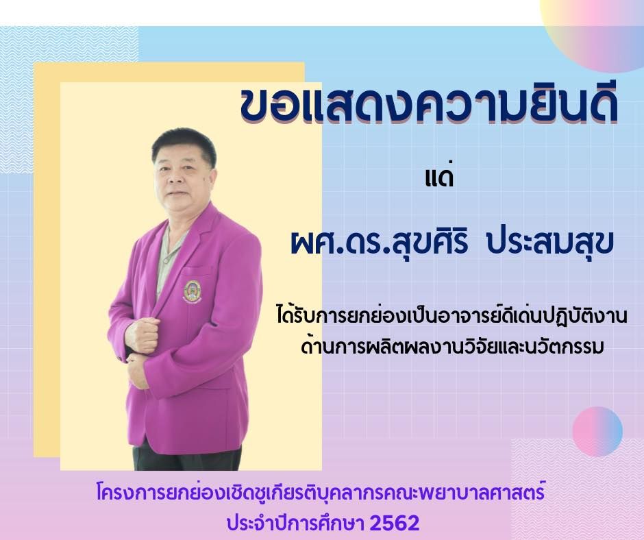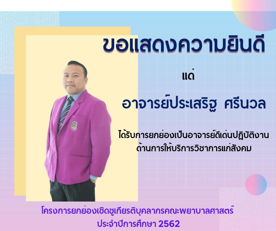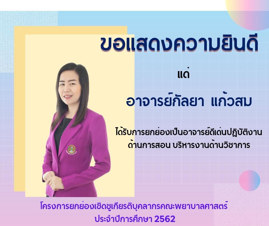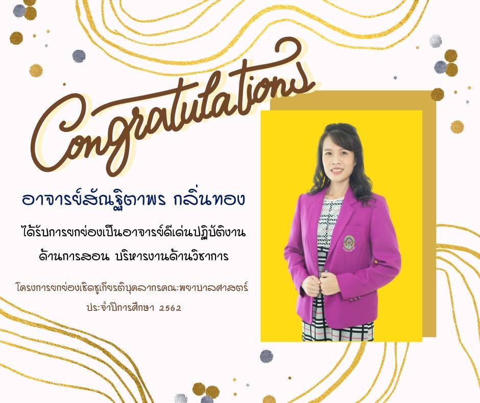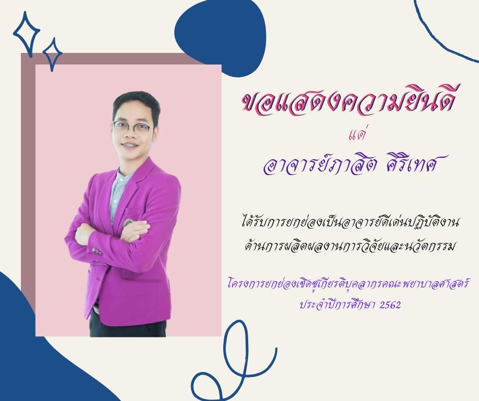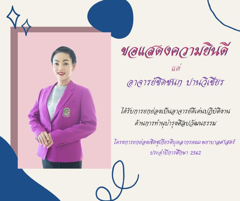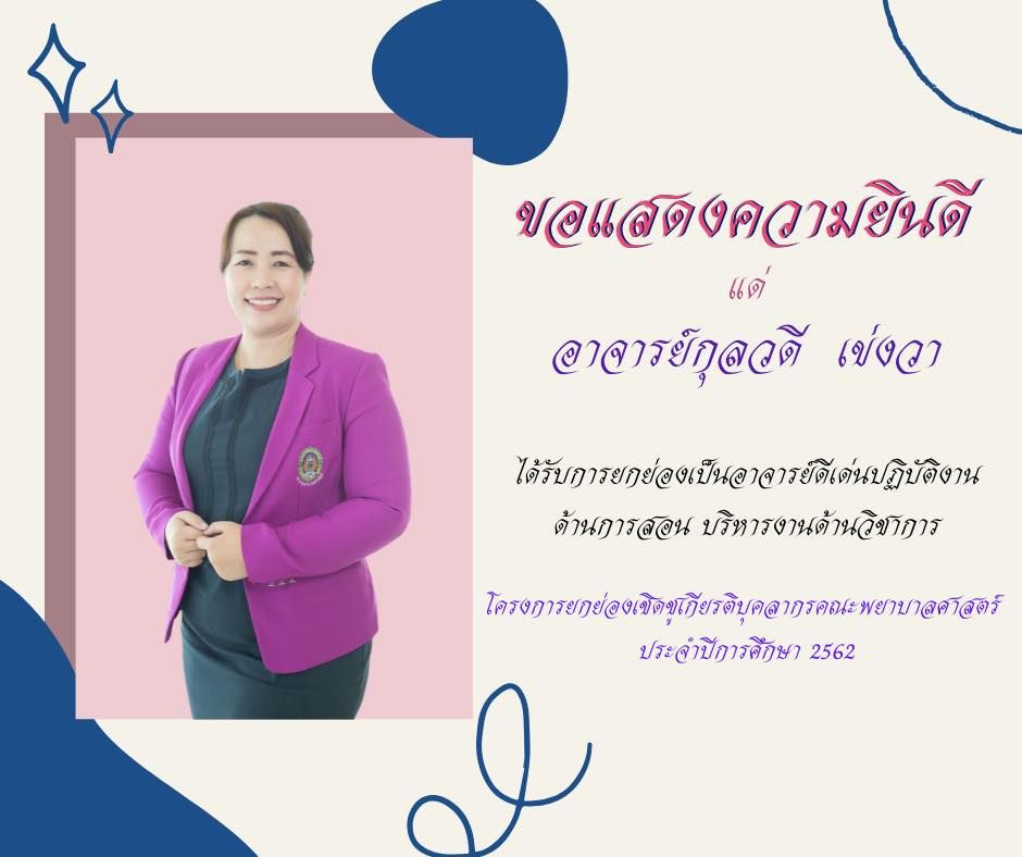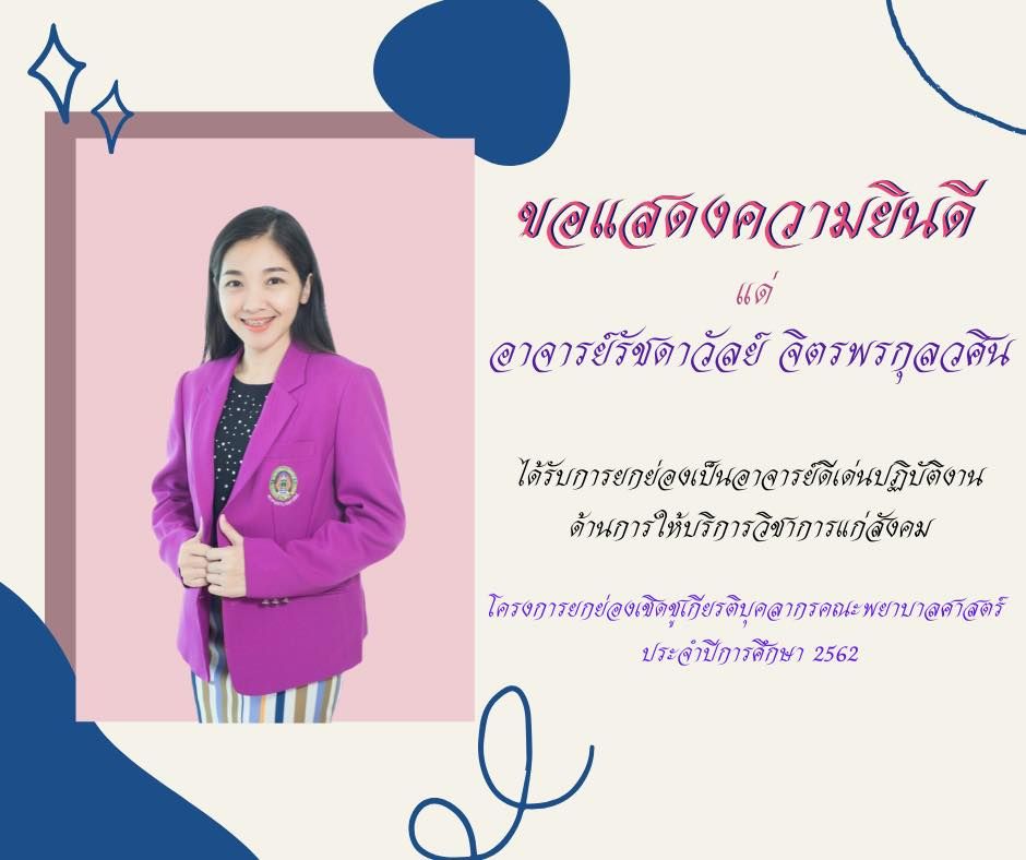 คณะพยาบาลศาสตร์ มหาวิทยาลัยราชภัฏเพชรบุรี ขอแสดงความยินดีแด่อาจารย์สาขาวิชาพยาบาลศาสตร์ อาจารย์สาขาวิชาการแพทย์แผนไทย อาจารย์สาขาวิชาสาธารณสุขศาสตร์ และบุคลากรสายสนับสนุนฯ ที่ได้รับรางวัลการยกย่องเชิดชูเกียรติบุคลากรคณะพยาบาลศาสตร์ ประจำปีการศึกษา 2562 โครงการการยกย่องเชิดชูเกียรติบุคลากรคณะพยาบาลศาสตร์ ณ วันที่ 19 มิถุนายน 2563